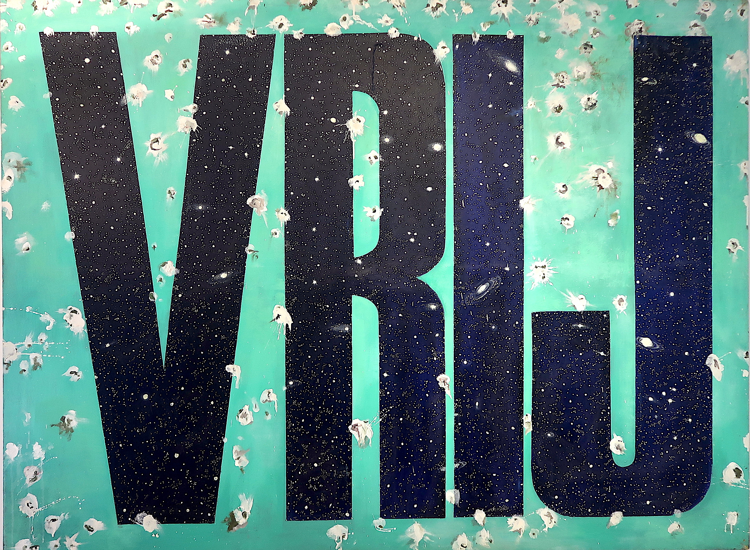 In deze Tentoonstelling laat zij een Aantal Werken zien, die Naar deze Vraag Verwijzen, zoals het Schilderij ‘VRIJ’ en ‘Zwart Gat’. Door Gebruik te Maken van Taal als een In Principe Onderscheidend Instrument zijn de Letters, die Samen het Woord VRIJ Vormen Hier Tot een Transparant Beeld Gemaakt. We zien een Doorkijkje Richting Kosmos, terwijl de Natuurgetrouw Weergegeven Excrementen Ins Herinneren aan het Aardse Bestaan. ‘Zwart Gat’ kan Op Verschillende Manieren worden Uitgelegd; de Verwijzing naar Zwarte Gaten, Worm Gaten en Witte Gaten in het Universum, maar ook naar de Metaforische Sprong in het Diepe. De Reis van de Held of de Heldin, die net Als In de Mythe van Theseus en Ariadne de Angst Overwint door het Monster te Verslaan, dat zich in het Labyrint van Koning Minos bevindt.