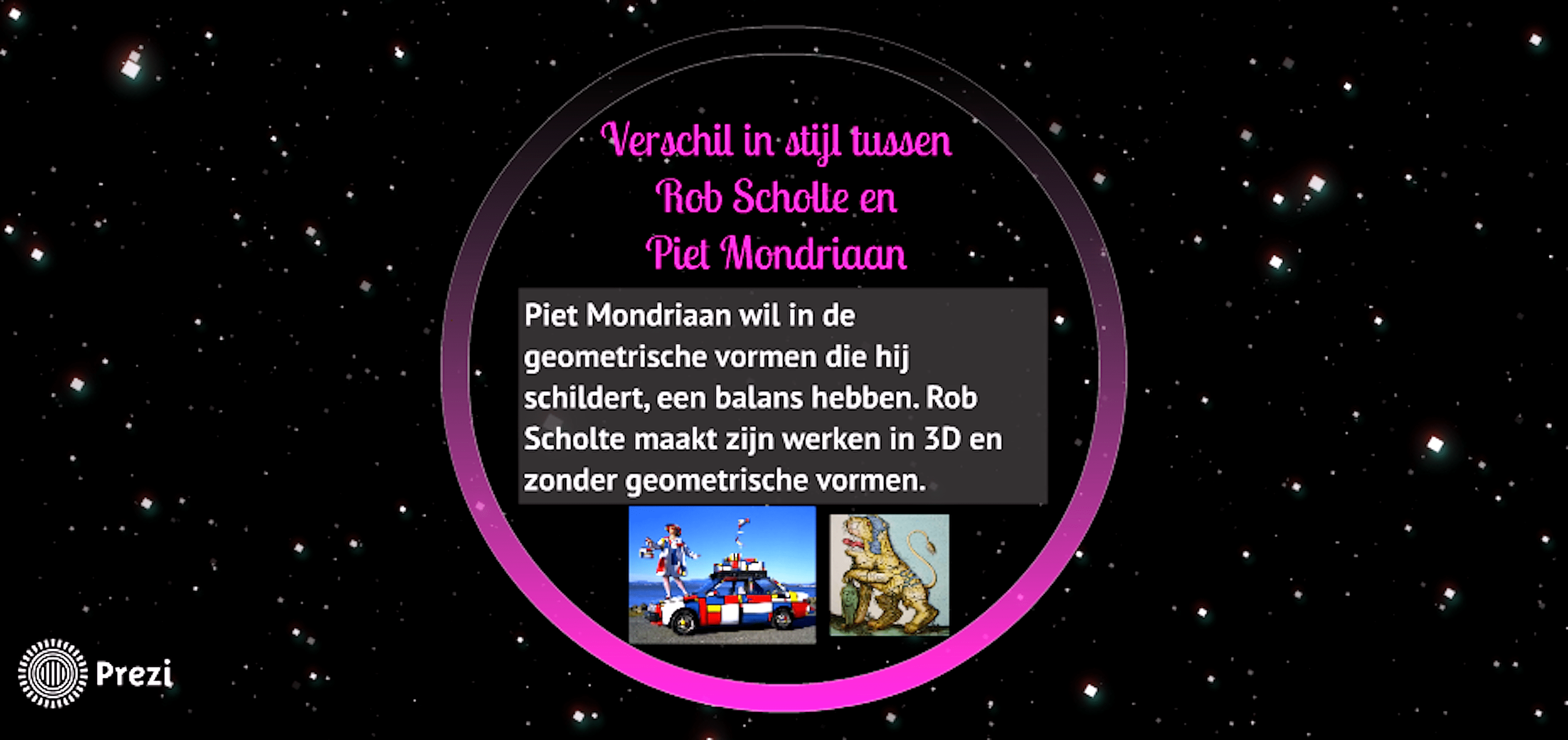 Piet Mondriaan wil in de geometrische vormen die hij schildert, een balans hebben. Rob Scholte maakt zijn werken in 3D en zonder geometrische vormen.
