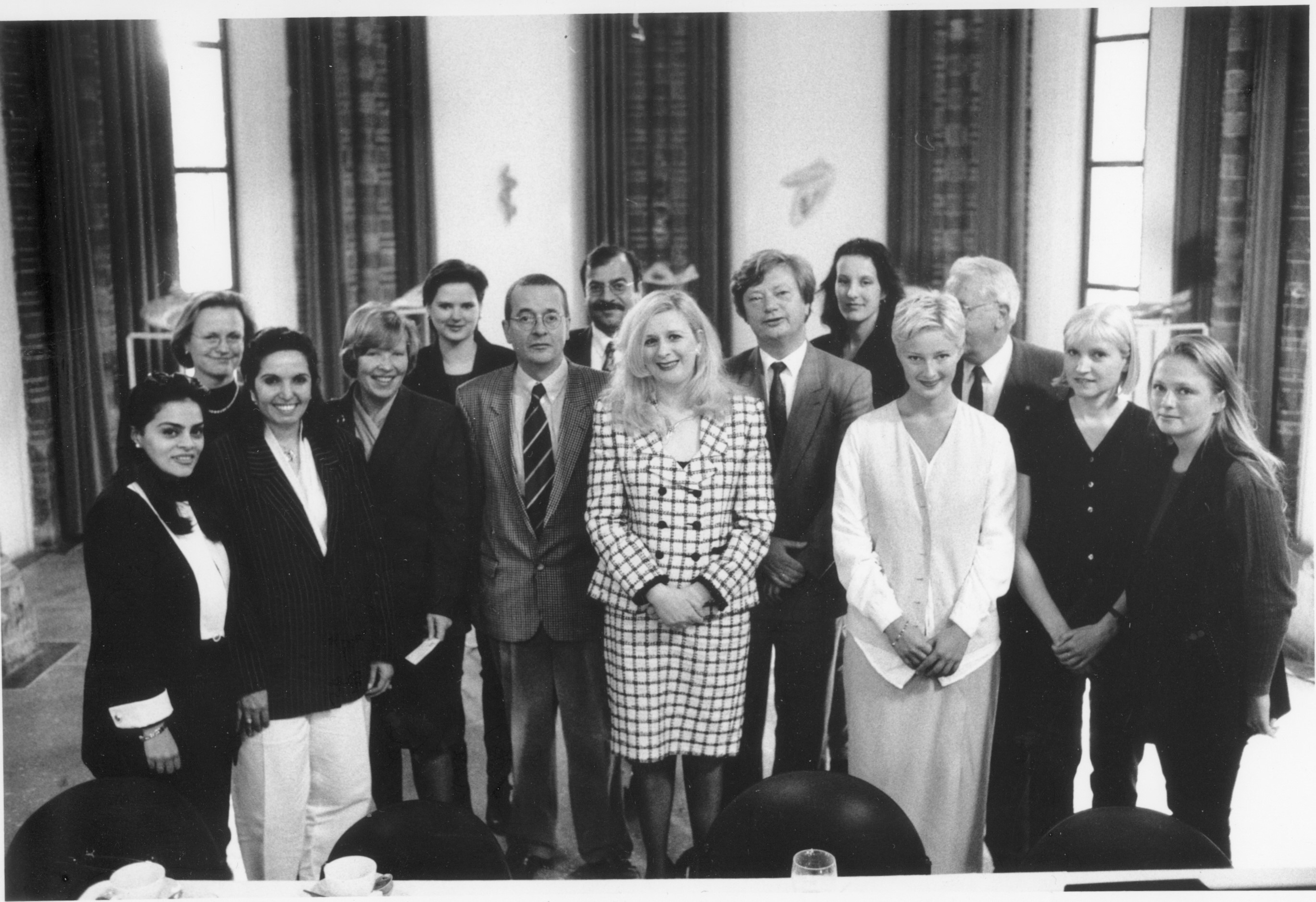 Maar het gaat om die dame in dat witgeruite mantelpakje. (Ik sta aan haar rechterhand, dus voor jou links, opnieuw mèt stropdas).
