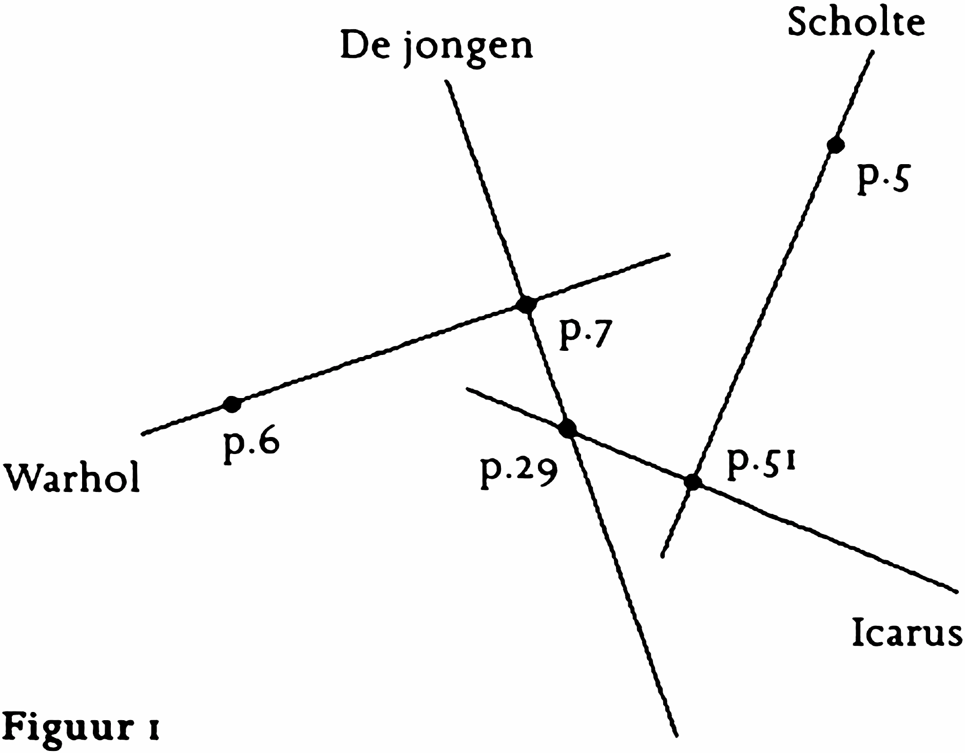 Maar er zijn grenzen aan die groei. Hoe meer tekstpassages je in de structuur probeert te betrekken, hoe duidelijker het wordt dat de suggestie van het doelmatig gesponnen web in figuur 2 vals is. Wat er met het web van verhaallijnen ‘misgaat’, is niet dat bepaalde verbanden onmogelijk kunnen worden gelegd, maar juist dat er te veel knooppunten zijn. Ook op plaatsen waar je die op grond van de tweedimensionale logica van de rechte lijn niet verwacht. Zo zijn er lijnen die niet parallel lopen, maar die elkaar toch in twee of meer punten kruisen. Dat teveel aan samenhang, zo zou je enigszins paradoxaal kunnen zeggen, vernietigt de samenhang. De indruk van een ingenieus gespannen web van verbanden die de bundel nadrukkelijk wekt (bijvoorbeeld ook doordat de metafoor van het (spinnen) web tot driemaal toe voorkomt), wordt tenietgedaan doordat er eenvoudigweg te veel verbanden zijn. De logica wordt als het ware door haar eigen middelen opgeblazen en het web wordt een warboel.