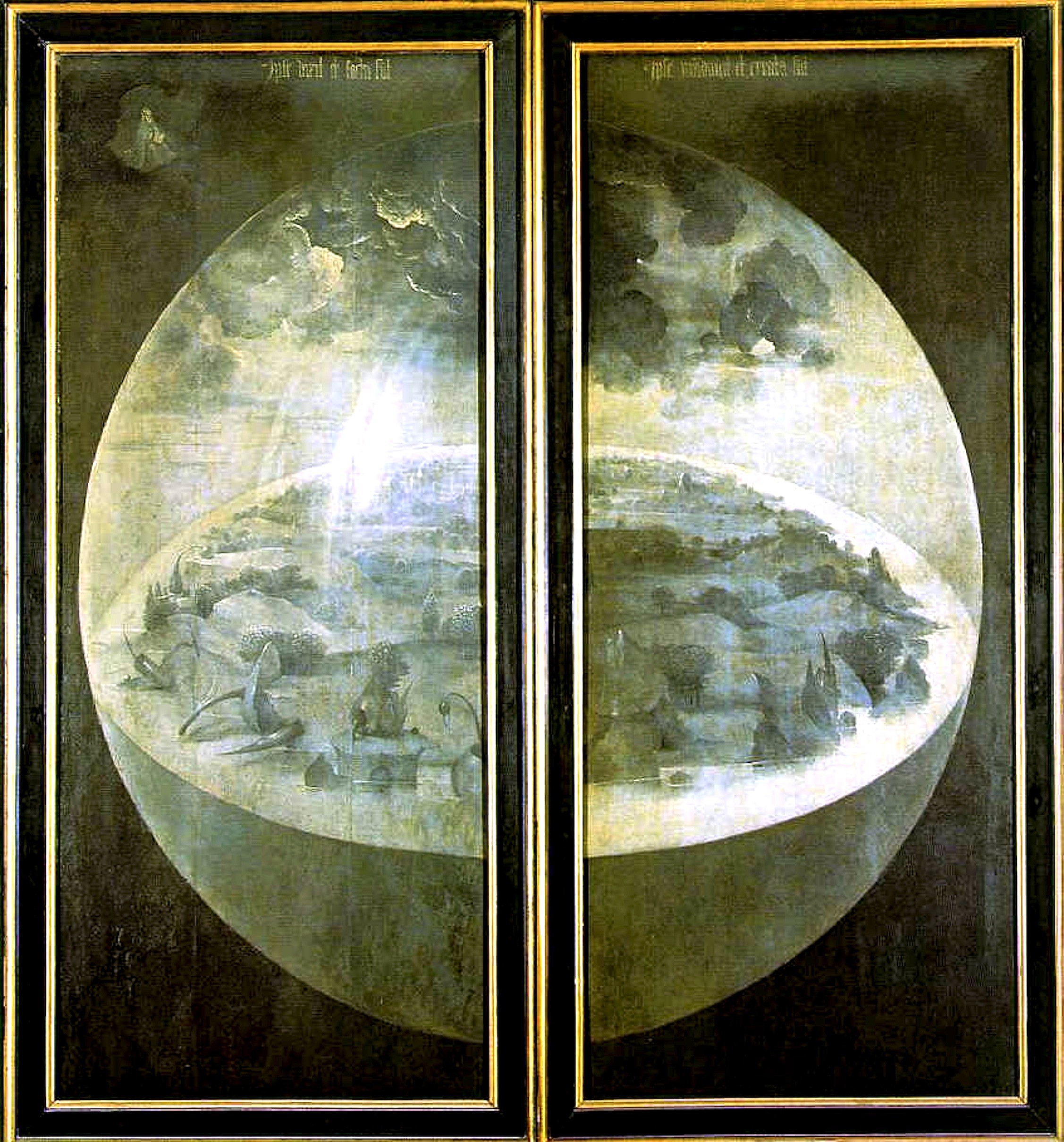 Bovenaan op het gesloten drieluik deelt Bosch ons het thema mee van dit werk; de schepping van de aarde, het aardse bestaan en het verval. Wanneer het paneel gesloten is, krijgen we een goed beeld van wat Bosch dacht over het uitzicht van de aarde. Rond, plat en omgeven door water. Samen met hem had de rest van de middeleeuwse bevolking hetzelfde idee.