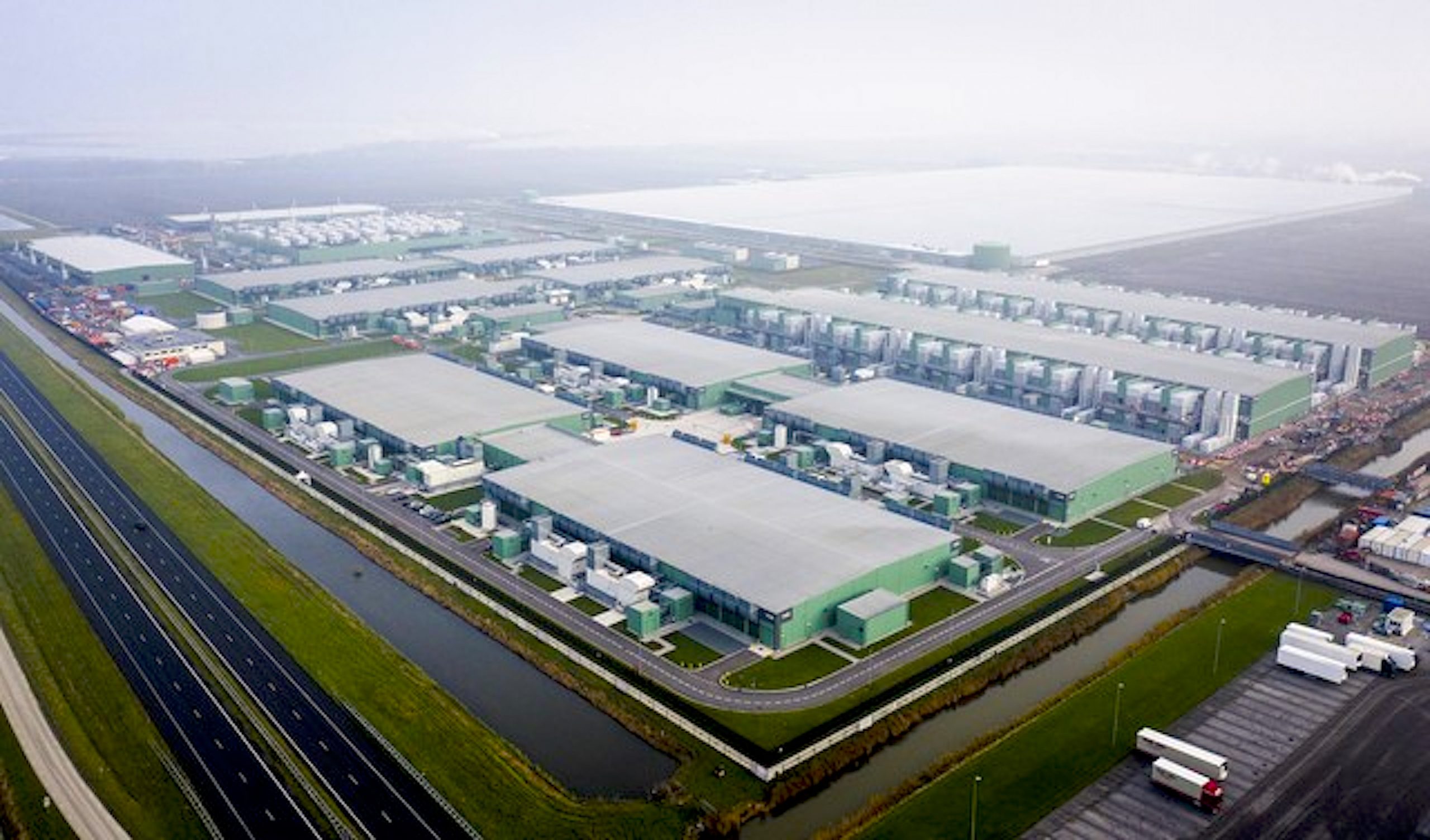 Drone foto van het datacenter van Microsoft in de Wieringermeer, dat dient als hub voor cloud diensten in Europa, het Midden Oosten en Afrika (foto Sem van der Wal)