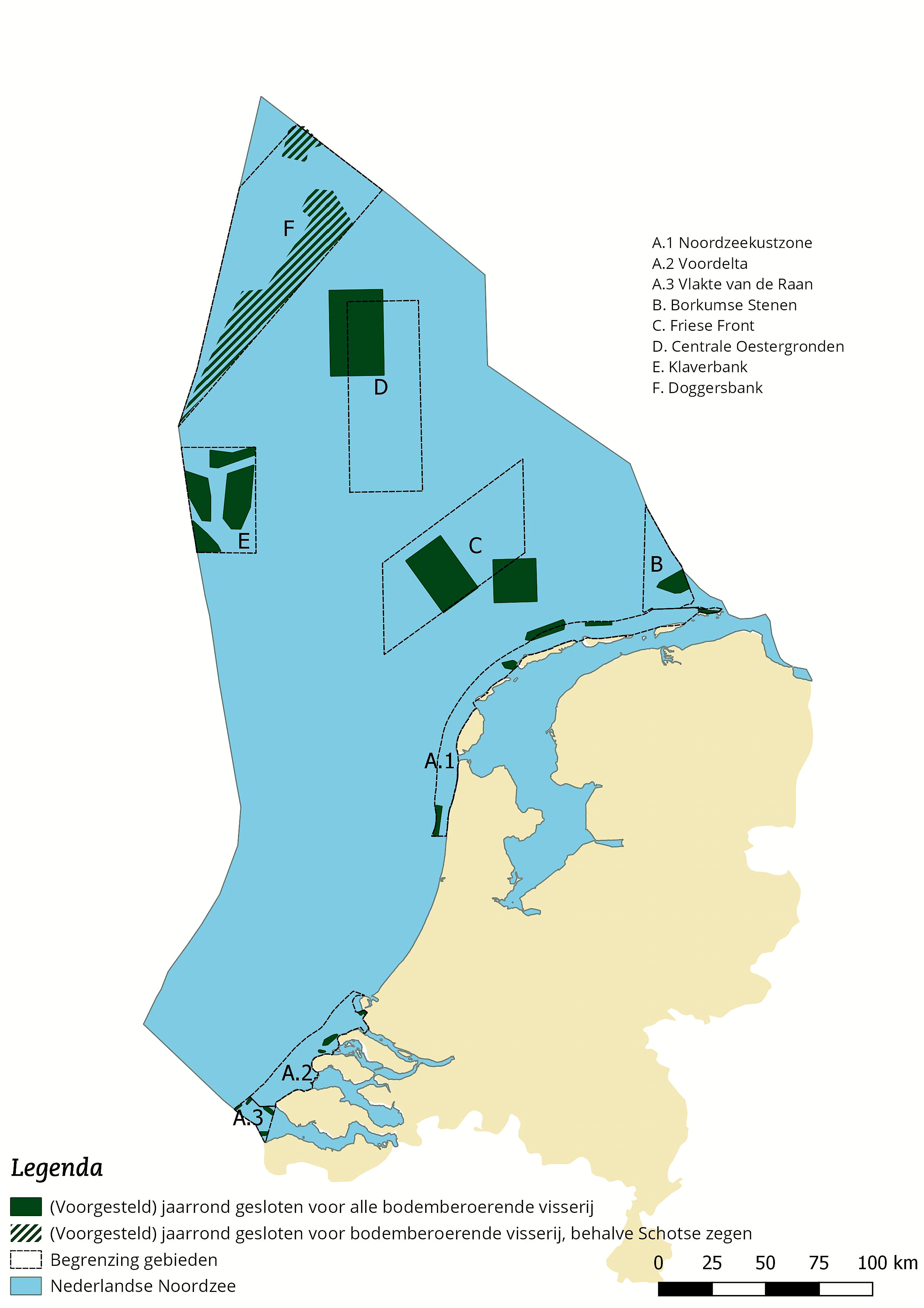 In de kustzone liggen drie beschermde gebieden: de Noordzee kustzone, de Voordelta, en de Vlakte van de Raan. Binnen al deze gebieden is in totaal zo’n 185 km (7,5 procent van het gebied, 0.3% van de Nederlandse Noordzee) volledig beschermd tegen alle vormen van bodem beroerende visserij.